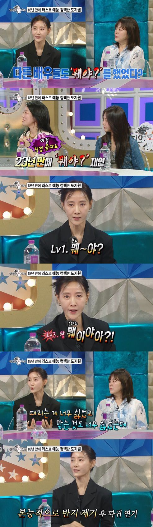 극 중 여러 버전의 ‘뭬야?’가 있었지만, 도지원의 ‘뭬야?’만이 끝까지 생존하게 된 것. 이어 도지원은 MC들의 요청에 ‘여인천하’ 이후 23년 만에 분노 단계별 ‘뭬야?’를 재연한다.