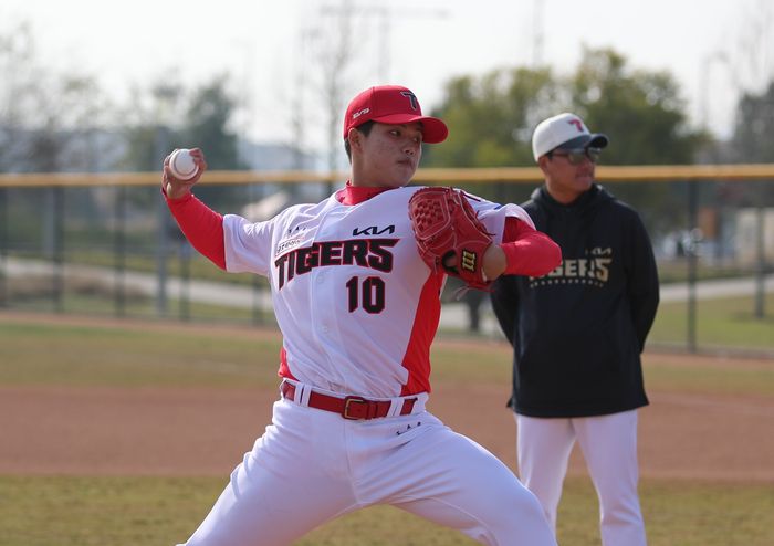 KIA 루키 김태형이 1일(한국시간) 미국 캘리포니아주 어바인에서 진행 중인 2025 스프링캠프에서 첫 불펜피칭을 실시했다. 정재훈 투수코치가 지켜보고 있다. 사진 | KIA 타이거즈 |