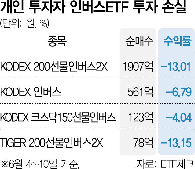 개인은 곱버스 이외에 증시가 하락할수록 이득을 보는 ‘KODEX 인버스(561억 원)’, ‘KODEX 코스닥150선물인버스(123억 원)’, ‘TIGER 200선물인버스2X(78억 원)’ 등을 순매수한 것으로 나타났다. 그러면서 국내 증시가 오를수록 돈을 버는 ‘KODEX 레버리지(-2396억 원)’, ‘KODEX 코스닥150레버리지(-1004억 원)’ 등은 대량으로 내다 팔았다.