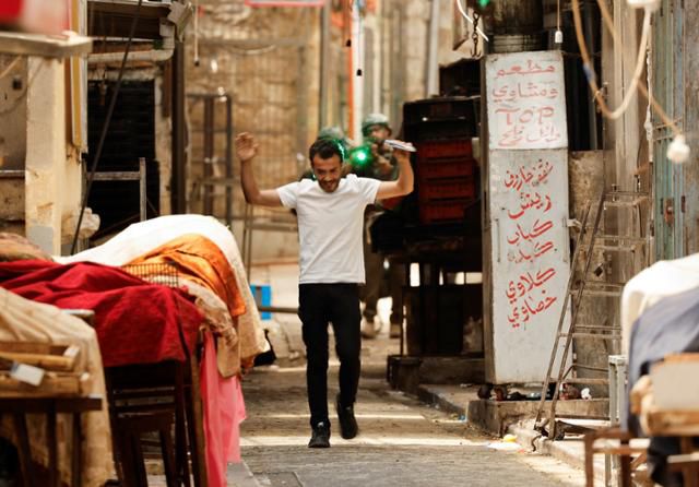 이스라엘이 점령 중인 서안지구(웨스트뱅크) 나블루스에서 이스라엘군 공습이 진행되는 동안 한 팔레스타인인 남성이 군인들의 총기 조준에 두 팔을 머리 위로 들고 있다. 나블루스=로이터 연합뉴스