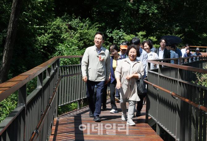 [이데일리 김태형 기자] 조성명(왼쪽) 강남구청장이 11일 일원장미공원에서 ‘대모산 따뜻한 동행길 조성 사업’ 준공식에 참석해 지역주민 등과 산책로를 걷고 있다.