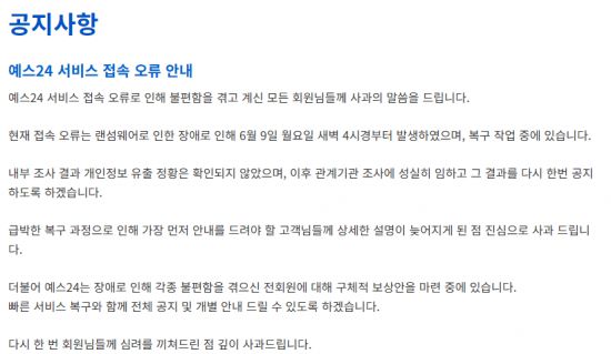 예스24는 지난 9일 새벽 4시경부터 접속장애 현상을 겪고 있다. 예스24는 이튿날인 10일 오후 1시경 KISA에 관련 내용을 신고했으나 이용자에게는 관련 내용을 숨기고 '내부 시스템 점검'이라고 안내해 비판에 직면했다. 나흘째인 오늘까지 예스24의 홈페이지와 앱의 모든 서비스가 이용 불가 상태다.