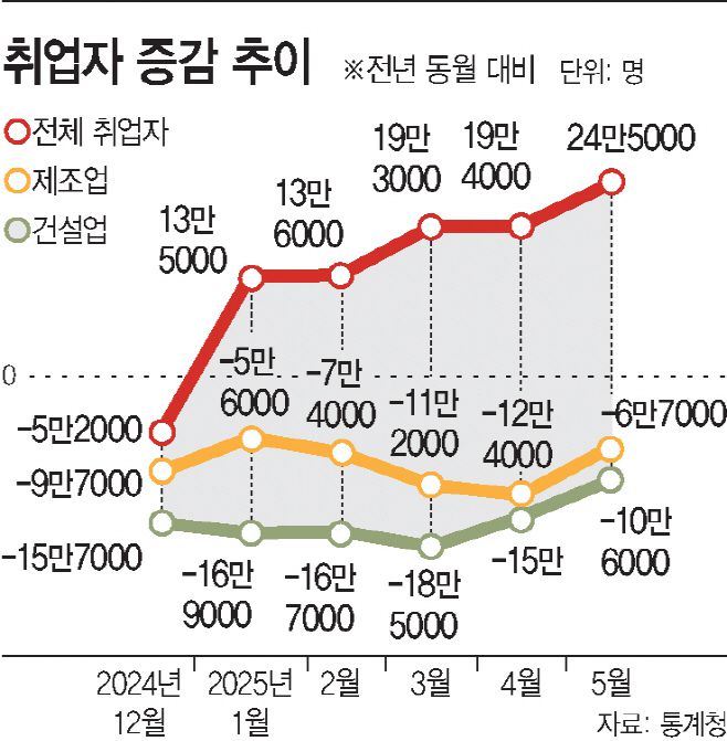 특히 제조업 취업자 수는 작년 7월 이후 11개월째 감소세가 이어졌고, 건설업 취업자 수도 지난해 5월부터 13개월 연속 '마이너스'를 기록했다. 숙박음식업 취업자 또한 6만7000명 줄며 2021년 11월(-8만6000명) 이후 42개월 만에 최대 감소 폭을 보였다.