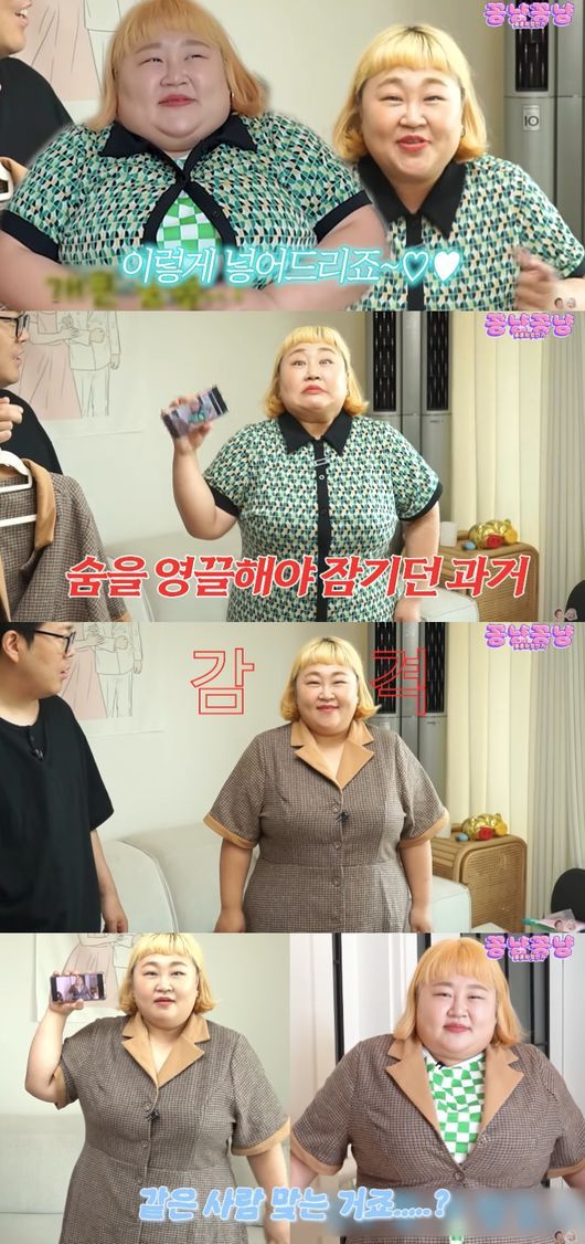 또 다른 옷을 입은 홍윤화는 “이게 잠긴다. 저땐 단추들 다 소리질렀다”라며 감격스러워했다. 김민기 역시 “윤화야 진짜 살 많이 빠졌다”라고 감탄했다.