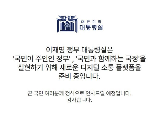 현재 홈페이지 메인 화면은 “이재명 정부 대통령실은 ‘국민이 주인인 정부’ ‘국민과 함께하는 국정’을 실현하기 위해 새로운 디지털 소통 플랫폼을 준비 중입니다”는 문구로 변경된 상태다.