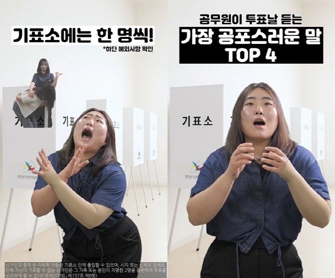 박 주무관은 ▲신분증 미지참 ▲기표소 내 동반 입장 ▲투표용지 재발급 요청 ▲비밀투표 원칙 위반 등의 상황을 가정한 뒤 고통스러워하는 듯한 혼신의 표정 연기로 웃음을 자아냈다.