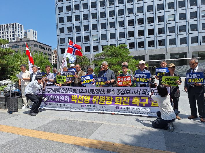11일 오전 11시 국가폭력 피해자와 시민단체로 구성된 국가폭력피해범국민연대는 서울 중구 진실화해위 앞에서 '박선영 퇴진 집회'를 열었다. 이들은 "국가기구에 의한 과거사 진실규명 조사는 중단됐고 이제 종합보고서 작성만이 남아있다"며 "박 위원장이 종합보고서를 8월까지 작성해 의결하겠다고 하는데, 졸속적인 종합보고서가 될 것이 뻔한 상황"이라고 했다.