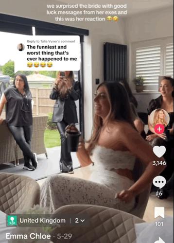 이 이벤트는 탈리아의 신랑에게도 사전 동의를 받은 것으로 알려졌다. 엠마는 탈리아의 반응을 촬영해 틱톡에 공유하며, "이건 가장 재미있는 처녀파티 아이디어"라는 설명을 덧붙였다. 해당 영상은 500만회 이상의 조회 수를 기록하며 화제를 모았다.