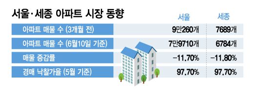 11일 부동산 빅데이터 업체 아실(아파트실거래가)에 따르면 서울 아파트 매물은 7만9710건(10일 기준)으로 집계됐다. 세 달 전 9만260건에서 약 1만550건(11.7%)이 감소했다. 세종시 역시 같은 기간 아파트 매물이 7689건에서 6784건으로 11.8% 감소했다.