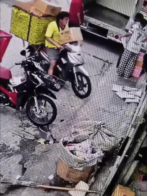 [서울=뉴시스] 강세훈 기자 = 10일(현지시간) 베트남 docnhanh 등 현지 매체에 따르면 태국 방콕의 한 창고 앞에서 오토바이 운전자가 무리하게 짐을 싣고 가다 넘어지는 장면이 포착됐다.