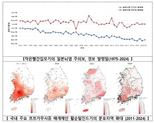 모기·진드기 등이 옮기는 감염병으로는 일본뇌염, 말라리아, 쓰쓰가무시증, 중증열성혈소판감소증후군(SFTS) 등이 있다. 실제로 2015~2024년 평균기온이 약 1.4도 오르면서 일본뇌염 주의보 발령 시기가 16일가량 빨라졌다. 쓰쓰가무시증의 주요 매개체인 활순털진드기도 2020년대 들어 고온 건조한 환경에 적응하면서 분포지역이 전국적으로 확대된 것으로 나타났다. 예년에는 여름에 주로 눈에 띄던 모기와 진드기의 활동기간이 봄부터 늦가을까지 길어진 것이다.