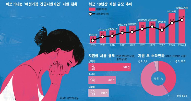 바보의나눔이 2021~2024년 우리엄마 사업 지원을 받은 여성가장을 대상으로 설문을 진행한 결과 응답자(576명)의 99%가 “지원이 자립과 역량 강화에 도움이 됐다”고 답했다. 지출 내역은 생계비(512건)·주거비(331건)·의료비(244건) 순으로 사용 비중이 높았다(중복 응답).