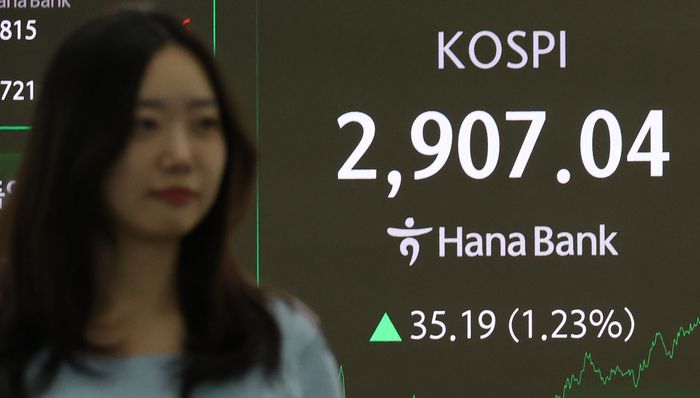 11일 서울 중구 하나은행 본점 딜링룸 현황판에 코스피가 표시돼 있다. 이날 코스피는 전장보다 35.197p 오른 2,907.04로 마감해 3년 5개월만에 2,900선을 돌파했다. [이승환 기자]