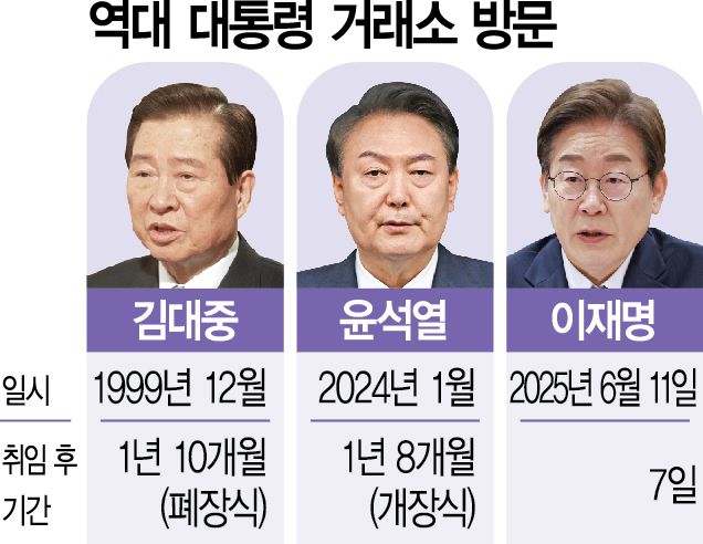 시장은 이른바 ‘이재명 랠리’를 이어갔다. 새 정부의 주가 부양이 단순히 주가지수 상승만을 의미한다기보다 경제·산업정책과 함께 공정한 시장 조성을 수반할 것이라는 기대에서 ‘실용적 시장주의 정부’의 기조를 우선 신뢰하는 모습이었다. 이날 코스피지수는 3년 5개월 만에 2900선을 넘어 2907.04에 거래를 마쳤다. 김대중·윤석열 전 대통령이 현직 대통령 재임 중에 한국거래소를 방문한 적은 있지만 취임 1주일 만에 거래소를 들른 것은 파격적이라는 평가다. 그만큼 이재명 정부의 친시장 행보에 대한 기대감이 적지 않다는 분석이다.