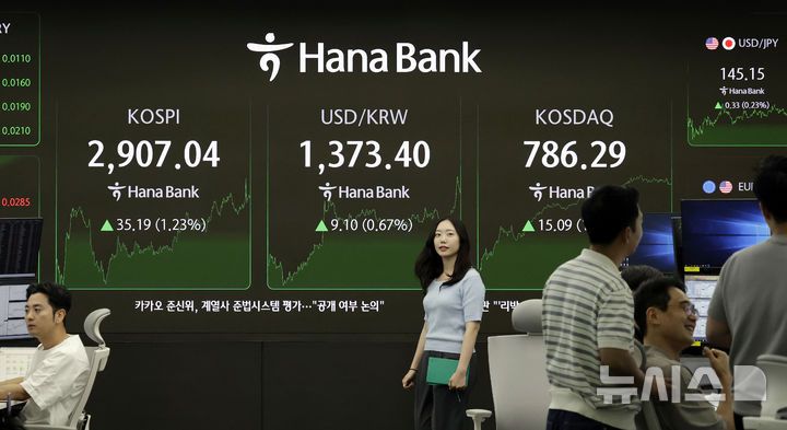 [서울=뉴시스] 최동준 기자 = 코스피 지수가 전 거래일보다 35.19포인트(1.23%) 오른 2,907.04로 장을 마친 11일 서울 중구 하나은행 딜링룸에서 딜러들이 업무를 보고 있다. 2025.06.11. photocdj@newsis.com |