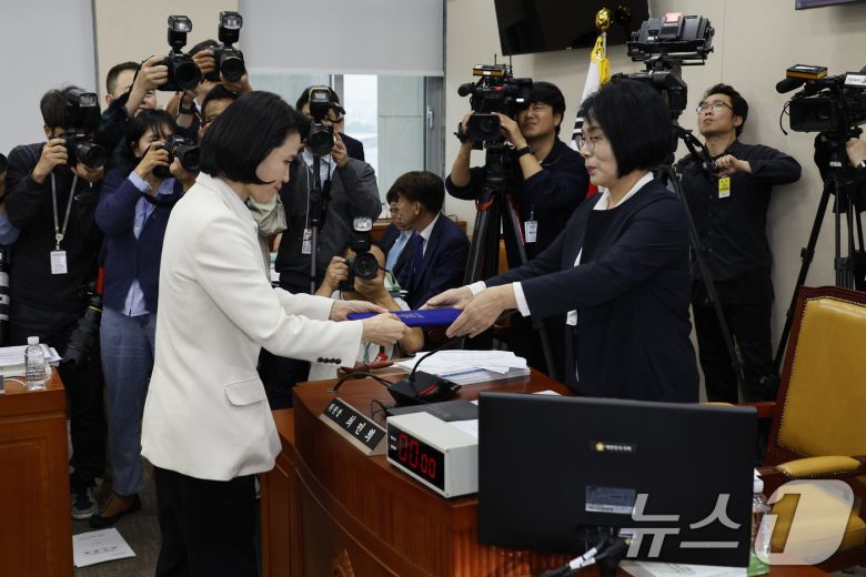 이진숙 방송통신위원회 위원장이 2024년 10월 7일 오후 서울 여의도 국회 과학기술정보방송통신위원회에서 열린 방송통신위원회·방송통신사무소·시청자미디어재단·한국방송광고진흥공사 국정감사에서 최민희 위원장에게 선서문을 제출하고 있다. 2024.10.7/뉴스1 ⓒ News1 안은나 기자 |