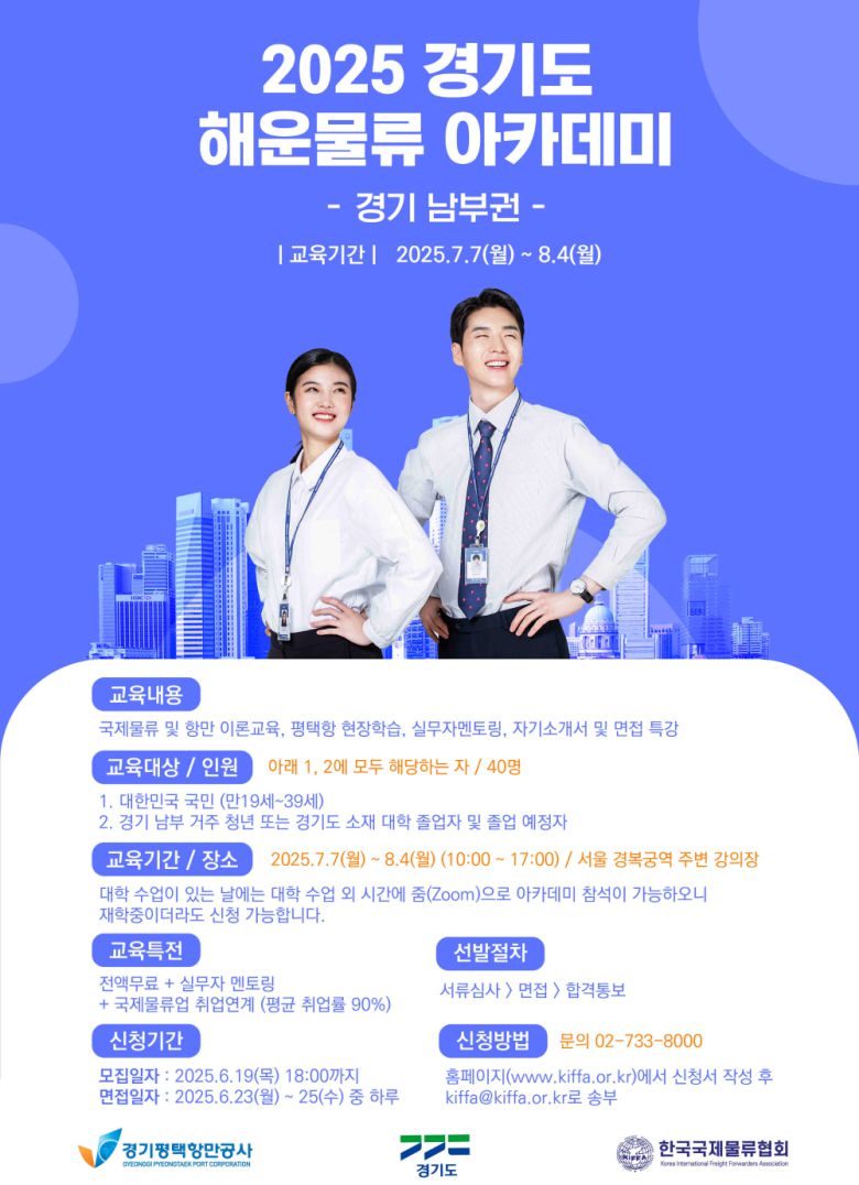 경기도와 경기평택항만공사는 해운·항만·물류 전문인력의 양성을 위해 오는 19일까지 '해운물류 아카데미' 교육생 40명을 모집한다고 밝혔다.