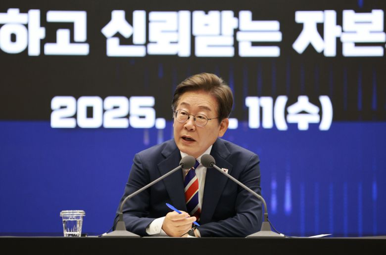 이재명 대통령이 11일 서울 영등포구 한국거래소에서 열린 주식시장 불공정거래 근절을 위한 현장 간담회에서 참석자 질문에 답하고 있다. [대통령실통신사진기자단]