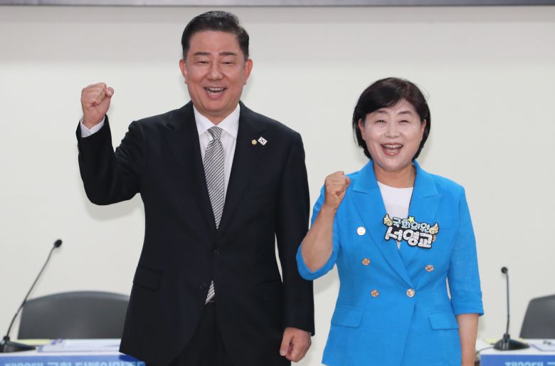 김병기·서영교 더불어민주당 원내대표 후보가 10일 오후 서울 여의도 국회 의원회관에서 열린 제22대 국회 민주당 제2기 원내대표 선출 합동토론회에서 포토타임을 갖고 있다. /남강호 기자 |