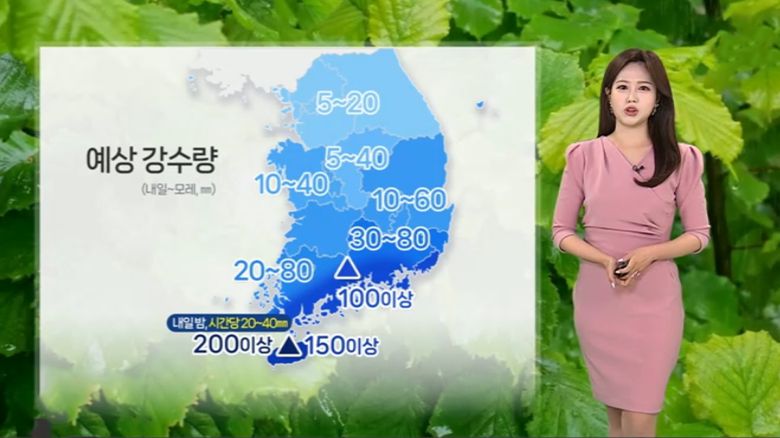 예상되는 강수량 보시면, 남해안에 최대 100㎜ 이상, 남부 지방에 최대 80㎜의 비가 내리겠고요.