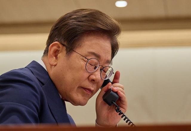 이재명 대통령이 11일 서울 용산구 대통령실 청사 집무실에서 페트르 피알라 체코 총리와 전화 통화를 하고 있다. 뉴스1