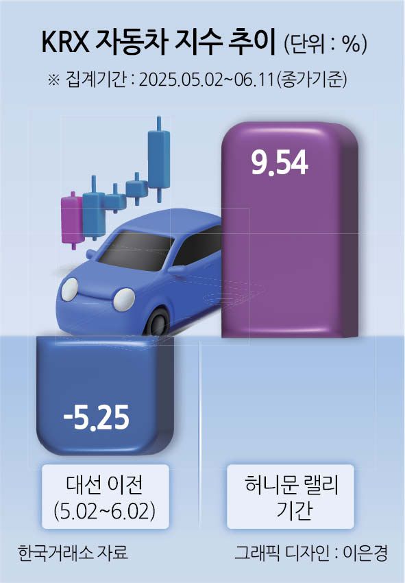 12일 한국거래소에 따르면 ‘KRX 자동차 지수’는 대선 전 관세에 크게 흔들린 한 달간 KRX 자동차 지수는 5.25% 하락했다. 하지만 대선 이후 상승 전환해 허니문 랠리기간 9.54% 올랐으며, 전체 산업지수 7위로 우뚝 섰다.