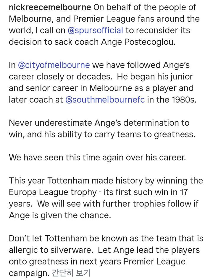 리스 시장은 "우리 멜버른에서는 수십 년 동안 포스테코글루 감독의 경력을 면밀히 지켜봤다. 그의 승리에 대한 결의와 팀을 위대한 업적으로 이끄는 능력을 절대 과소평가해서는 안된다. 올해 토트넘은 유로파리그 트로피를 들며 역사를 썼다. 포스테코글루 감독에게 기회를 좀 더 준다면 더 많은 트로피를 들 수 있을 것이다. 토트넘이 은식기 알레르기를 앓는 팀이 되게 하지 마라. 이듬해에도 포스테코글루 감독이 토트넘을 이끌게 해달라"고 강조했다.