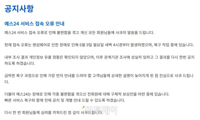 한편 예스24는 최근 해킹 사태와 관련해 한국인터넷진흥원(KISA)과 협력해 원인분석 및 복구 작업에 총력을 다하고 있다는 입장문을 발표했다.