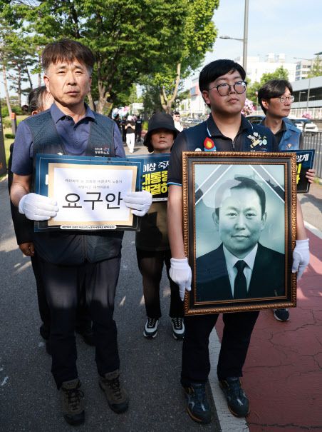 엄길용 공공운수노조 위원장, 유족, 태안화력발전소 사고 대책위 관계자가 지난 6일 서울 용산 대통령실 청사 인근 전쟁기념관 앞에서 사고 희생자 고(故) 김충현 씨와 관련해 강훈식 대통령비서실장에게 요구 서한 전달하기 위해 이동하고 있다. (사진=연합뉴스)