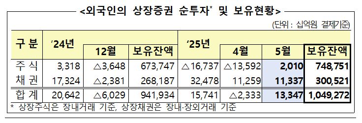 [아이뉴스24 김민희 기자] 외국인이 5월 한 달간 국내 주식시장에서 2조100억원어치를 사들이며 10개월 만에 순매수세로 전환했다. 채권시장에서도 국채 중심의 순매수가 이어지며 외국인의 국내 채권 보유 규모도 사상 처음으로 300조원을 돌파했다. 이는 미국 금리 안정과 원화 강세 기대가 반영된 결과로, 외국인의 전체 상장증권 투자 규모역시 1000조원을 넘겼다.