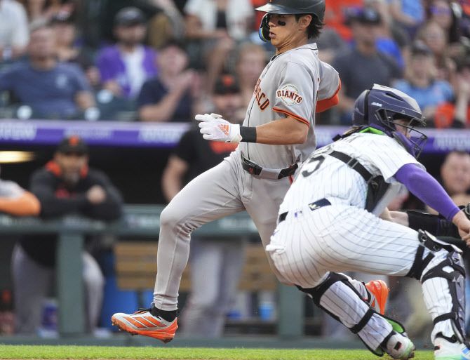 샌프란시스코 자이언츠 이정후가 콜로라도 로키스와 경기에서 윌리 아다메스의 희생타 때 상대 포수의 태그를 피해 홈을 밟고 있다. 사진=AP PHOTO |