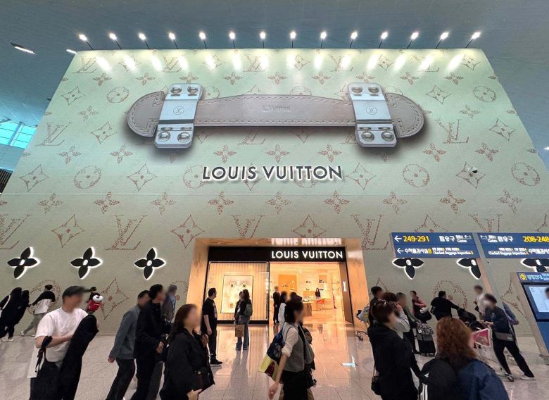 [헤럴드경제(인천)=신현주 기자] 12일 오전 9시에 방문한 인천국제공항 제2여객터미널은 많은 인파로 붐볐다. 3층 면세구역에 들어서자 오른편에 거대한 루이비통 모노그램 벽에 저절로 눈이 갔다. 일반 매장의 두 배에 달하는 높이였다. 거대한 트렁크를 연상시키는 외관에 고개를 젖혀 매장 외벽을 만져보는 외국인들도 보였다.
