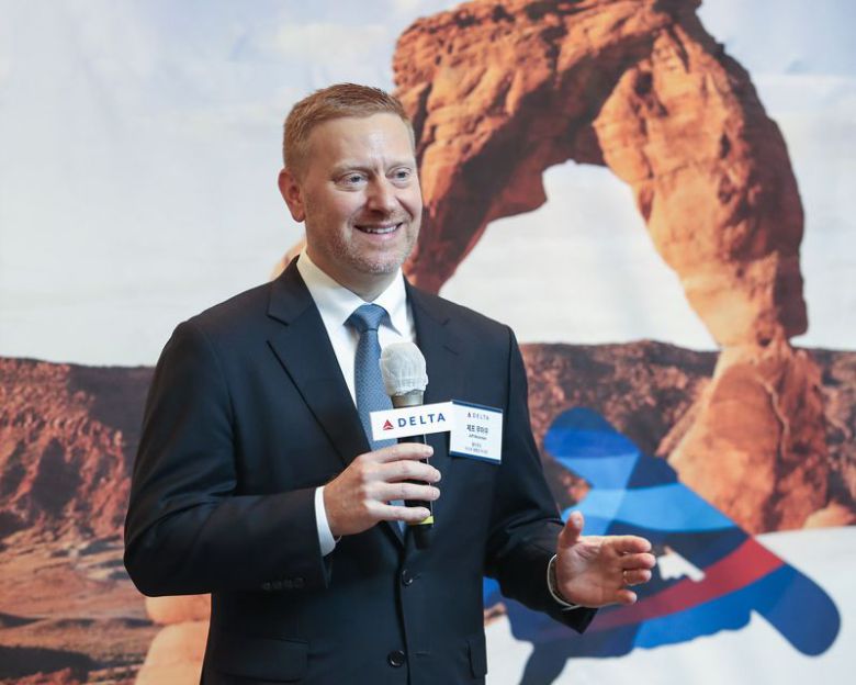 제프 무마우 델타항공 아시아 태평양 부사장이 12일 오전 코트야드 바이 메리어트 남대문 서울에서 열린 기자간담회에서 발언을 하고 있다. 델타항공 제공 |