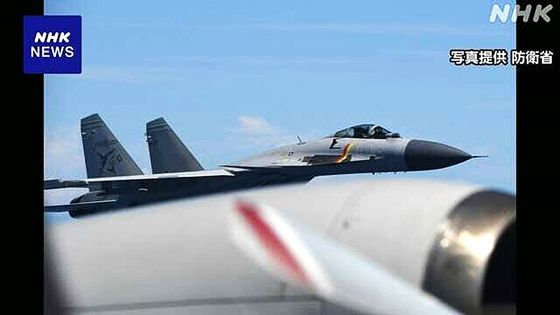 일본 정부는 태평양에서 지난 7~8일 중국군 전투기가 자위대의 초계기에 이상 접근을 했다고 발표하고, 심각한 우려를 표명했다. 사진은 일본 초계기에 접근한 중국군 J15 전투기. 사진 NHK 캡처 |