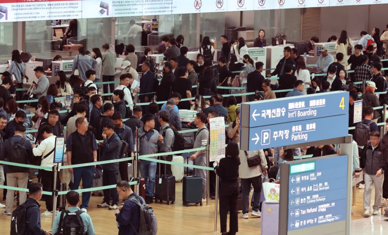 여행업계에서는 해외여행을 떠나려는 여행객이 늘어나면서 여행사들도 대목을 잡기 위한 마케팅에 분주하다. 반면 소상공인들은 소비가 살아날 기미가 없다며 낙심하는 분위기다. 사진은 5월 28일 인천국제공항 1터미널 출국장 모습 [연합]