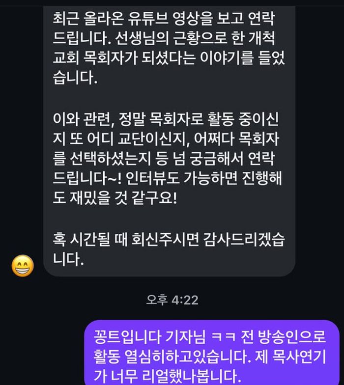 그는 한 기자가 “정말 목회자로 활동 중이신 게 맞냐”고 보낸 메시지에 “콩트입니다 기자님ㅋㅋ 전 방송인으로 활동 열심히 하고 있습니다. 제 목사 연기가 너무 리얼했나봅니다”라고 답한 대화 내용을 공개했다.