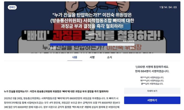 ‘행동하는사회연대경제인’은 방송통신위원회 사회적협동조합 빠띠 과징금 부과에 반발하며 온라인 서명운동을 시작했다. 온라인 서명운동 화면 갈무리 |