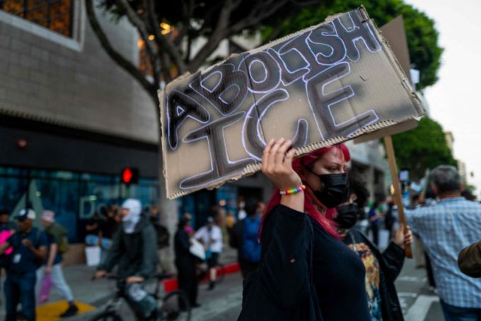 0일(현지 시간) 미 캘리포니아주 로스앤젤레스에서 성조기와 멕시코 국기를 든 시위대가 이민세관단속국(ICE)의 불법 이민자 단속을 규탄하고 있다. /AP=뉴시스
