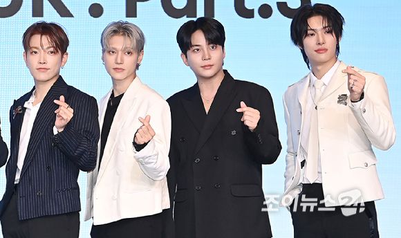 그룹 에이티즈가 12일 오후 서울 마포구 호텔 나루 서울 엠갤러리에서 열린 미니 12집 '골든 아워 : 파트 3'(GOLDEN HOUR : Part.3) 앨범 발매 기념 기자간담회에서 포즈를 취하고 있다. [사진=곽영래 기자] |