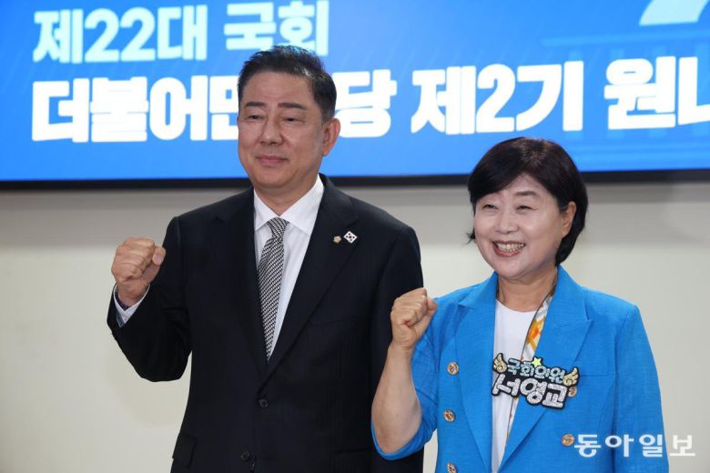 김병기·서영교 더불어민주당 원내대표 후보자가 10일 오후 서울 여의도 국회 의원회관에서 열린 민주당 2기 원내대표 후보 합동토론회에 참석해 선전을 다짐하고 있다. 2025.06.10 이훈구 기자 ufo@donga.com |
