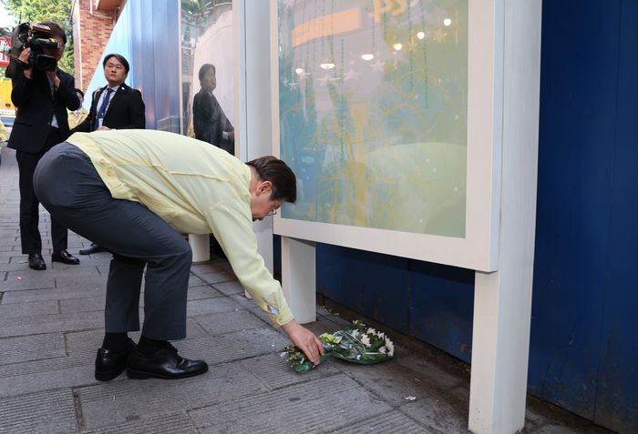 이재명 대통령이 12일 수해 대비 현장 점검을 위해 서울 서초구 환경부 한강홍수통제소 방문을 마친 후 이태원참사 사고현장을 찾아 헌화하고 있다. 김호영기자