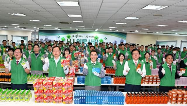HJ중공업이 12일 부산 영도구 영도조선소에서 영도구 지역 저소득 취약계층과 복지사각지대 1,000가구를 위한 4,000만 원 상당의 선물꾸러미 나눔 행사를 열었다. 선물꾸러미 1,000세트는 HJ중공업 임직원들이 자발적인 모금으로 마련해 사회복지관 관계자들과 직접 포장했다.