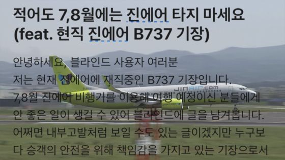 여름 휴가철을 앞두고 직장인 익명 커뮤니티 '블라인드'에 '7,8월에는 진에어 타지 마세요'라는 제목의 글이 올라와 논란이 되고 있습니다. 글쓴이는 자신을 진에어 소속 B737 기장이라고 밝혔습니다. 그러면서 비행기 조종사가 부족한 상황이라 여름 성수기에 예약하면 비행 취소라는 불상사를 맞이할 수 있다고 경고했습니다.