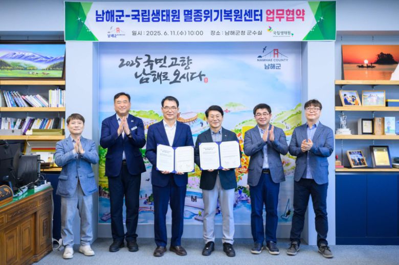 경남 남해군(군수 장충남)과 국립생태원 멸종위기종복원센터(센터장 최승운)가 11일 멸종위기 야생생물 보호와 생물다양성 증진을 위한 업무협약(MOU)을 체결했다.