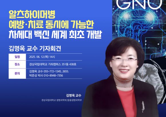 경상국립대는 생명과학부·응용생명과학부 김명옥 교수 연구팀이 ‘알츠하이머병 예방과 치료가 동시에 가능한 차세대 에피토프 백신’을 개발했다고 12일 밝혔다.