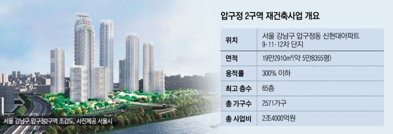 압구정2구역 재건축은 1982년 준공된 신현대아파트(9·11·12차) 1924가구를 2571가구로 탈바꿈하는 것으로 총공사비는 약 2조4000억 원이다. 조합은 이달 중 입찰공고를 내고 9월 조합원 총회를 통해 시공사를 선정할 계획이다.