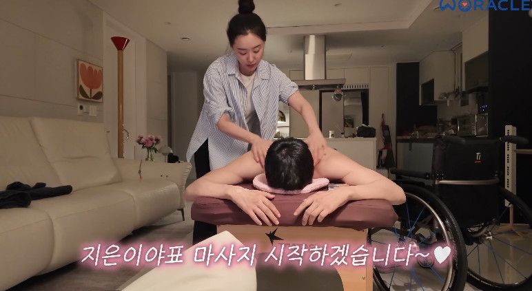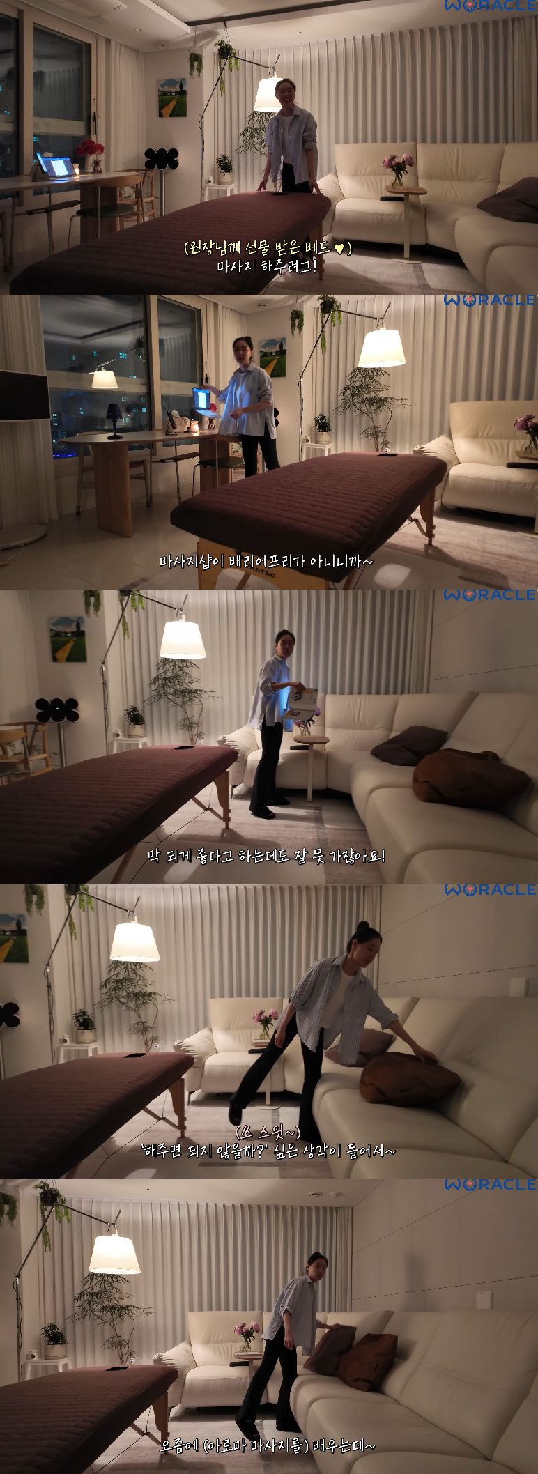 해당 마사지 침대는 한 원장님에게 선물 받은 거라고. 이어 송지은은 "그게 너무 속상했다. 오빠가 마사지 받으러 가는데, 마사지샵이 배리어프리가 아니니까 막 되게 좋다고 하는데도 잘 못 가지 않냐. 그래서 집에서 내가 '해주면 되지 않을까?' 싶은 생각이 들어서 요즘 (아로마 마사지를) 배우는데 너무 재밌더라"며 남편을 위해 마사지 기술을 배우고 있는 근황을 밝혔다.