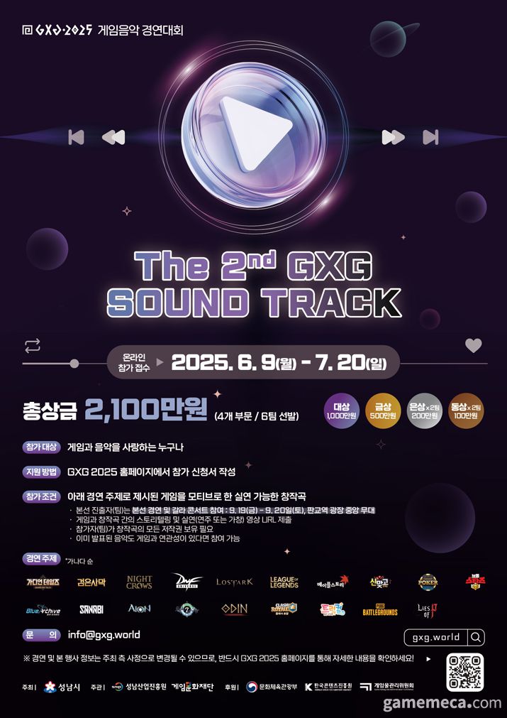 게임문화재단은 9월에 판교에서 열리는 게임문화축제 'GXG 2025'의 메인 프로그램인 'GXG 2025 게임음악 경연대회(이하 GXG 사운드트랙)'의 참가자를 모집한다.