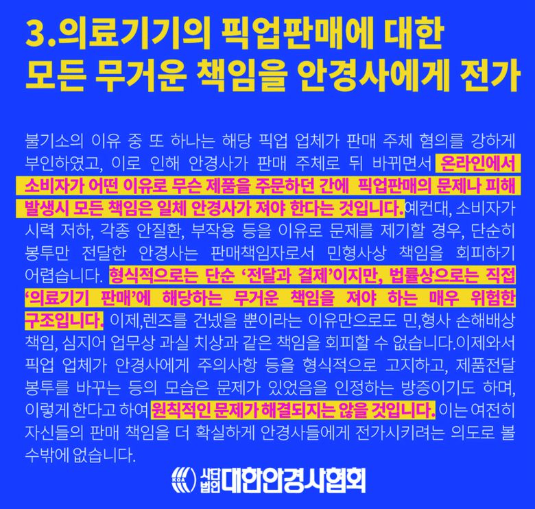 검찰 또한 "검안 없이 제품 봉투만을 전달하는 행위는 문제의 소지가 있다"고 지적한 바 있다. 업계에서는 이 구조가 안경사에게 일방적으로 책임을 떠넘기는 위험한 방식이라는 점에서 우려를 나타내고 있다. 소비자가 온라인을 통해 어떤 제품을 어떤 이유로 주문했든, 결국 제품을 전달한 안경사가 모든 법적 책임을 감당해야 하는 구조이기 때문이다. 특히 단순 전달에 불과했더라도 민·형사상 책임까지 발생할 수 있는 상황이 충분히 예상된다.
