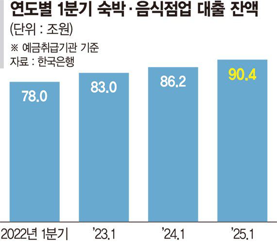 대표적인 내수 업종인 숙박·음식점업의 금융권 대출액이 사상 처음 90조원을 넘어섰다. 내수 경기 침체가 장기화하는 가운데 소비심리 위축으로 영업이익이 쪼그라든 영향으로 풀이된다.